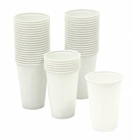 Klasyczne kubeczki jednorazowego użytku, plastikowe, białe.